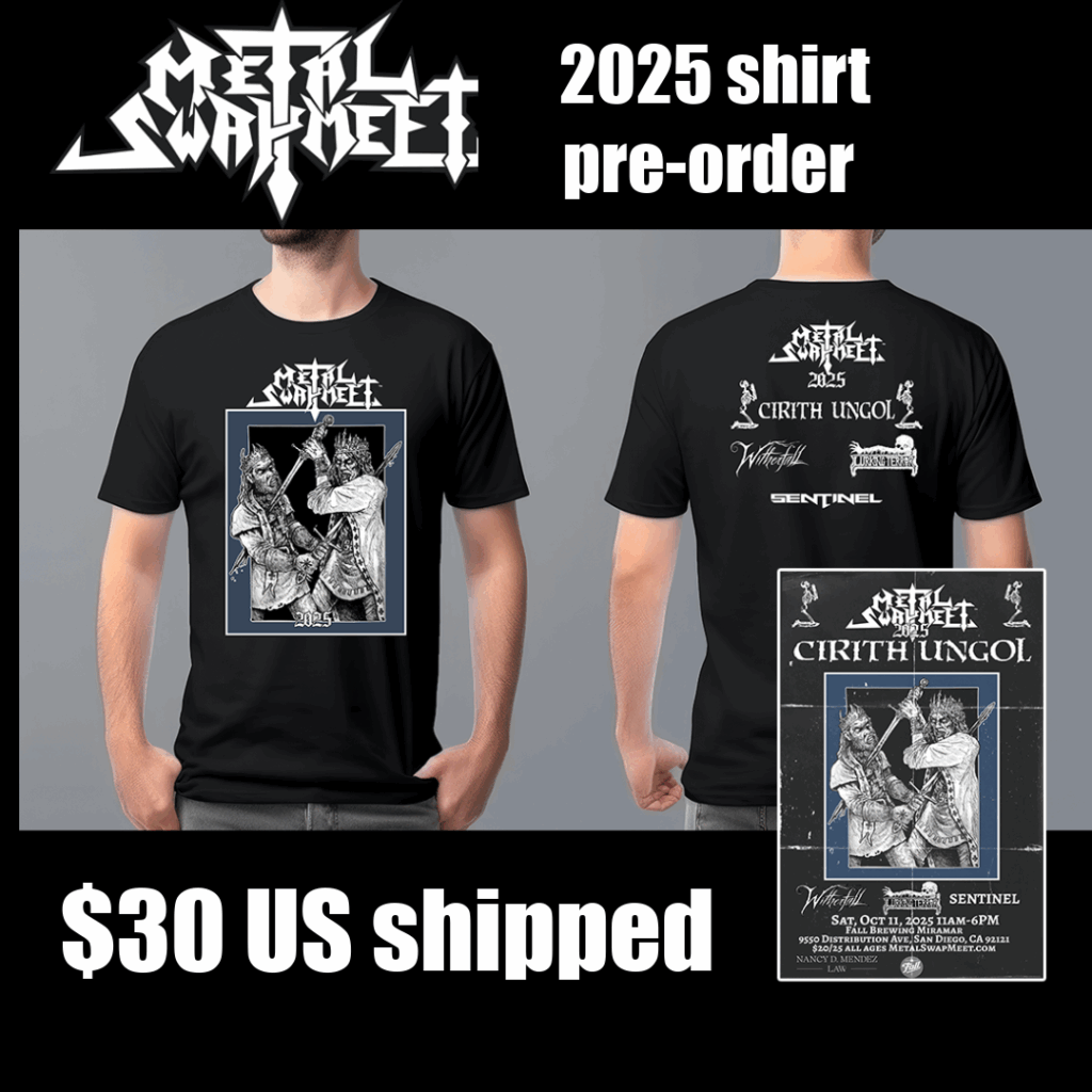We ordered 80 shirts for Metal Swap Meet to sell at the event at Fall Brewing Miramar, but they sold out fast. Now’s your second chance to get a Metal Swap Meet 2025 shirt. The shirt features a 2 color front design by Arnold Barba. The back shows logos of all 4 bands who played, Cirith Ungol, Witherfall, Lurking Terror, and Sentinel. $30 shipped, and only to the lower 48 US states. If you would like them shipped outside, contact us directly. Orders will be made to order, and shipped every 2 weeks.